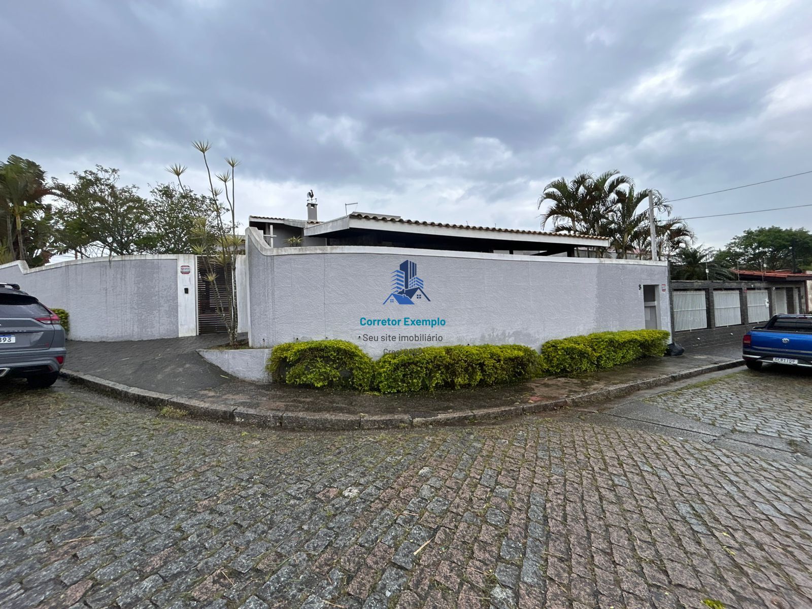 Garagem para três carros pequenos ou dois grande, churrasqueira e piscina, quarto para guardar ferramentas e outros objetos.